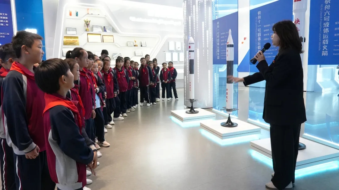 隨后,少先隊員們與快舟固體運載火箭親密接觸,現(xiàn)場參觀,并到火箭公司科普展廳開展見學(xué),豐富翔實的圖文資料、視頻動畫、快舟系列火箭模型等,展示了中國航天事業(yè)的輝煌成就、快舟火箭的發(fā)展歷程,以及人類對未來太空探索的夢想。少先隊員們駐足觀看,不時向身邊的講解員發(fā)問,對中國航天抱有極大興趣。
