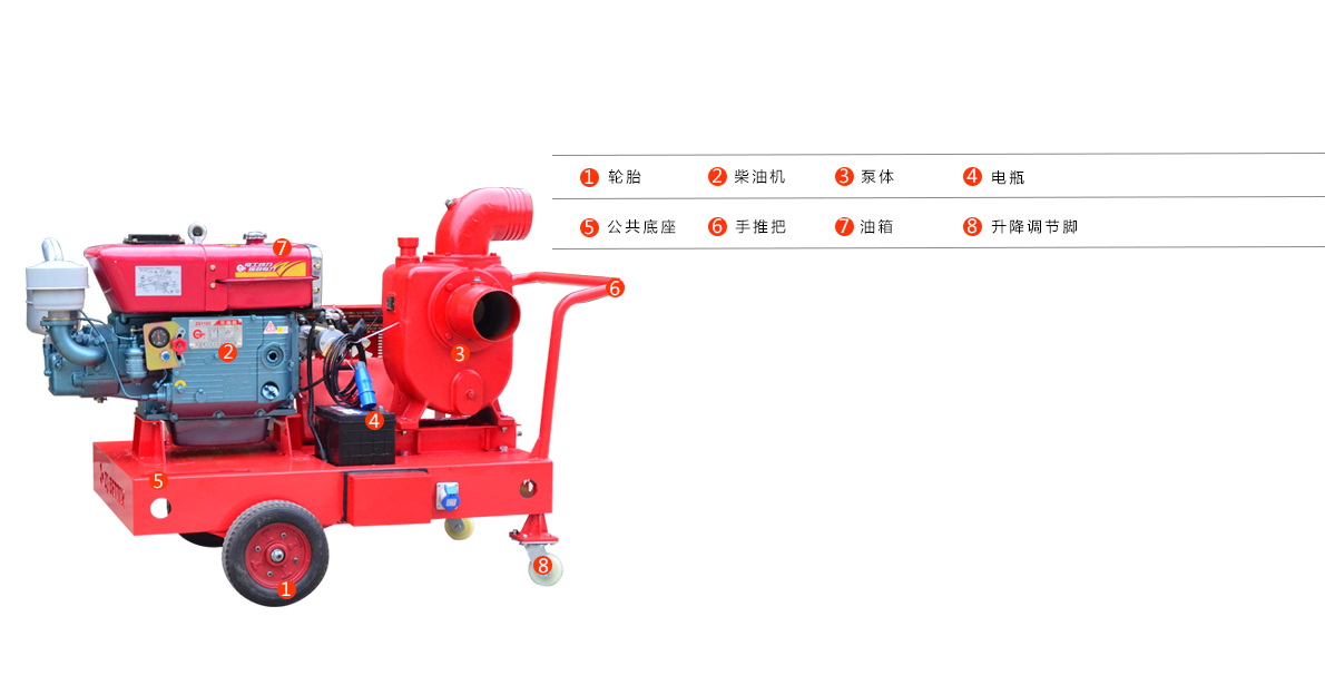 1.手推式強自吸移動泵車主要由真空輔助裝置、柴油機動力包、柴油機專用油箱、泵傳動系統、設備底座、自吸泵總成、防雨設施、起動裝置、起動電源裝置、進水管總成、出水管總成、二輪移動拖車系統、快速起吊裝置等組成。